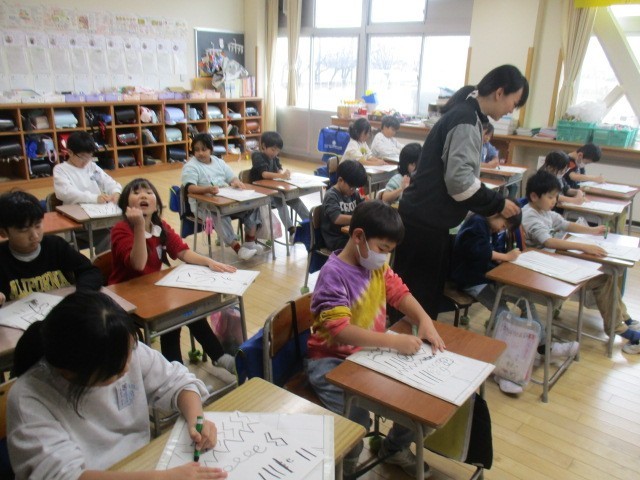 2年生の5時間目は、書写の学習でした。硬筆墨で太く濃く文字をかく練習をしていました。