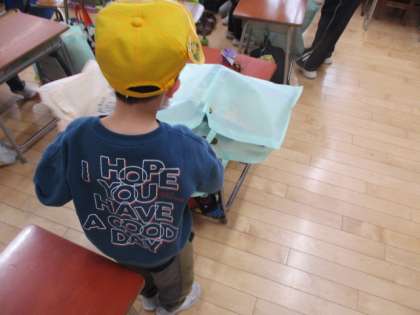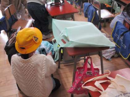 1年生が学習で使ったものを大きな袋にまとめていました。