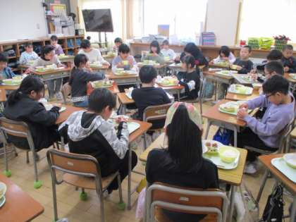 5年生は教室の友だちと楽しそうにグループでの会食を楽しみました。