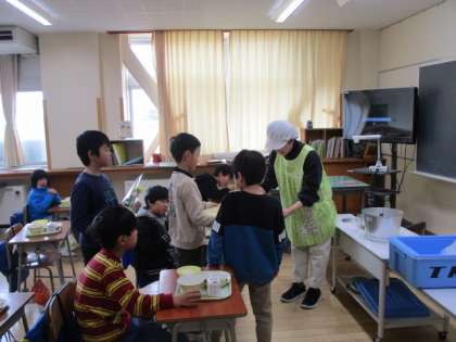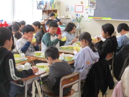 それぞれの学年では、みんなで楽しく食べる工夫をして仲良く食べていました。明日からしばらく給食を食べられないのは、とても寂しいですね。 -