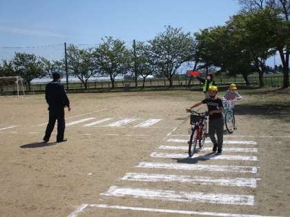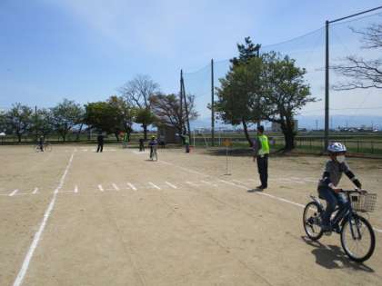 気持ちのよい風が吹く中、自転車安全教室が行われました。5年生は交通規則や自転車の安全な扱い方について教室で学んだ後、グラウンドで自転車に乗っての実技を行いました。