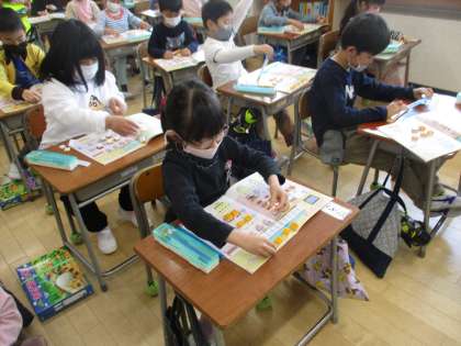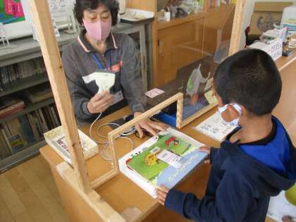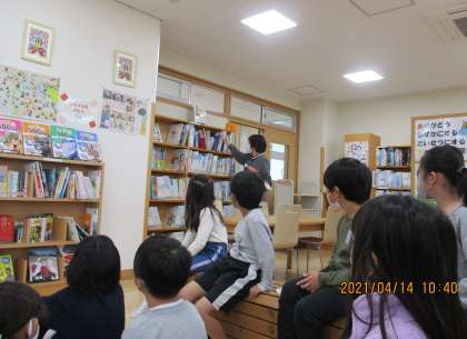 学校司書の先生に図書館の使い方についてオリエンテーションをしてもらいました。本の分類の仕方や置いてある場所を教えてもらった後、大型絵本を読んでもらいました。みんな、「ぶたやまさん」の本をおもしろそうに聞いていました。