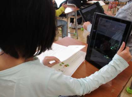 国語科「きつつきの商売」の教科書にQRコードが出ているので、クロムブックで読み取ってみました。一人一人が「木のうろ」や「たちつぼすみれ」を画像で見ることができました。QRコードを読み取ることで、きつつきや野ねずみたちが暮らす森の様子についてさらに想像が広がりました。他の教科書にもQRコードは出ているので、クロムブックを活用していきたいと思います。