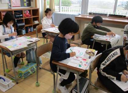 図工の学習で「にじ色の町」に取り組みました。水彩絵の具の使い方を確認した後、「にじ色の町」ってどんな町かなとイメージを膨らませながら描きました。絵筆で、細い線やまっすぐな線、くるんと曲がる線など、いろいろな線で表すことを楽しみながら描いていました。
