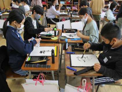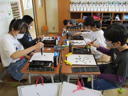 墨や水を使って、和紙に思い思いの模様を描きました。筆の種類や墨の濃淡を工夫しながらいろいろと試し描きをした子供たち。にじんだり広がったりする様子を楽しみながら作品を作りました。