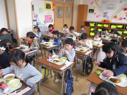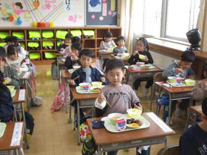 今日は初めての給食でした。給食当番の子も上手に準備することができました。子供たちは、苦手な食べ物がある子もいましたが、どの子もおいしそうに食べていました。