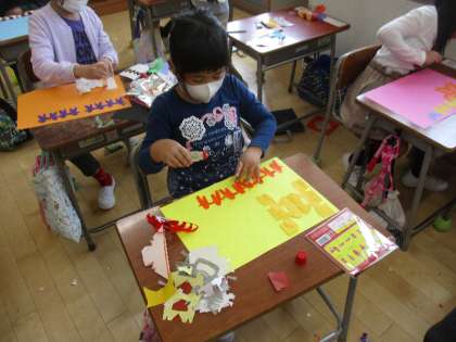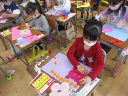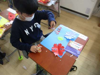 図画工作科で、「ちょきちょき かざり」の学習をしています。今日は折り紙を切って、飾りを作りました。思い通りの飾りにならなかった子供もいましたが、予想外の形になり、「こんなのできたよ!」と楽しそうに活動していました。