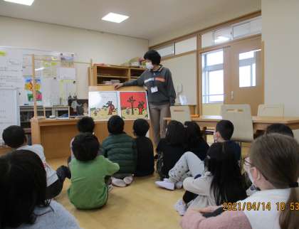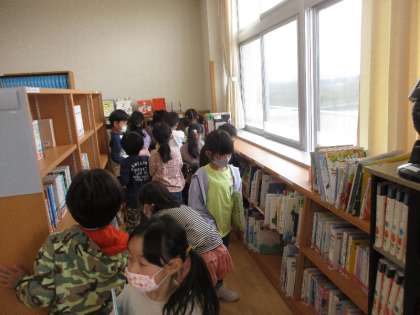 初めて図書室を利用しました。司書の先生に図書室の使い方を教えてもらった後に、絵本を読んでもらいました。大きな絵本に子供たちは興味津々で、集中して見ていました。