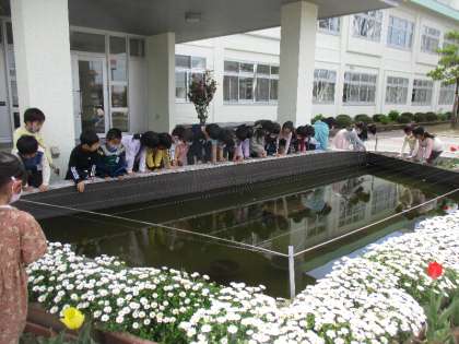 また、毎朝通っている職員玄関前の池を初めてじっくり見たようで、泳ぐ金魚の様子をじーっと見ていました。