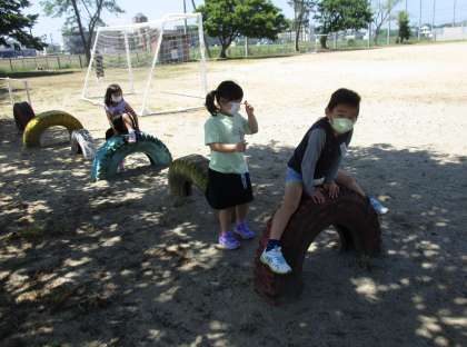 休み時間には、友達と距離を取って遊べる遊びを自分たちで考え、工夫しながら楽しく過ごす姿が見られました。 -