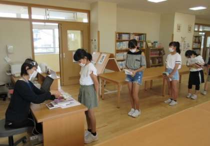 朝、登校した子供たちは、静かに読書をして過ごしています。図書室の出入りも一方通行とし、貸し出しを待つ間の距離も意識して並んでいます。返却された本は、消毒して棚に戻す作業も行っていますので、ご安心ください。