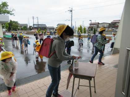 今日から、子供たちが登校を始めました。朝は、混み合わないように玄関前でしっかりと間隔をあけて並ぶ姿が見られました。一人一人校内に入る前に消毒をしています。声を出す代わりに、会釈であいさつをする子供もいます。すてきなくらがきっこが、学校に帰ってきました!
