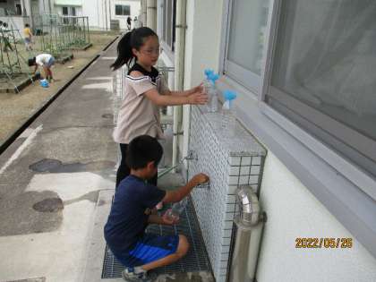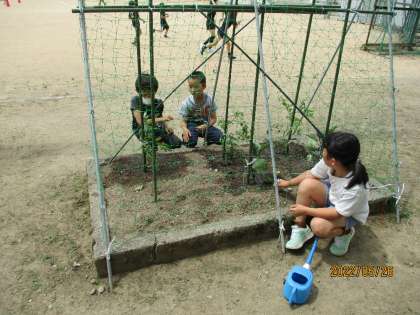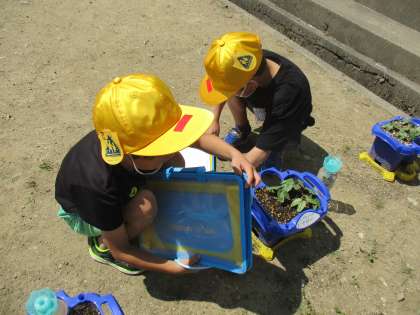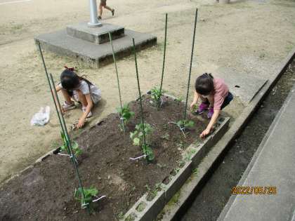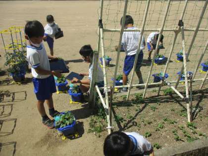 休み時間になると、2年生の子供たちが野菜の苗のお世話をしていました。