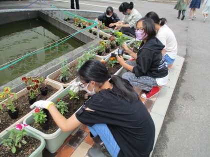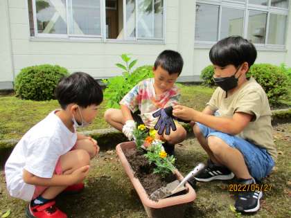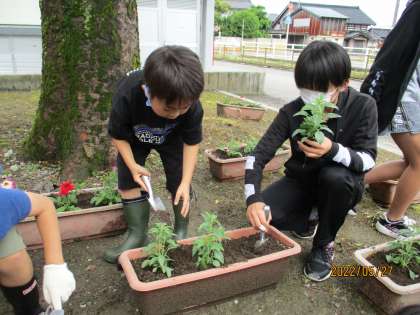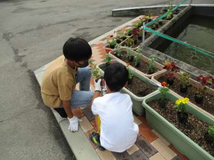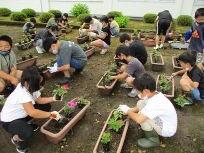 笑顔いっぱい委員会の呼びかけで、苗を植えたい人を募集し、プランターに花の苗を植えました。倉垣小学校を花で明るくしようと、たくさんの児童が参加しました。また、上学年が下学年に教えながら植える姿も見られ、みんなで協力して活動しました。きれいに咲くのが楽しみですね。