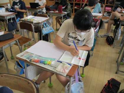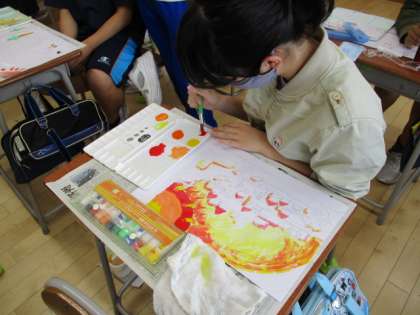 図画工作科では、未来の富山市を描いています。夢と希望あふれる、明るい富山市を想像しながら、絵に表しました。子供たちは、自然がもっと豊かな様子や空飛ぶ車が入っている町など、こんな富山市だったらいいなということを思い浮かべながら、楽しんで活動しています。子供たちは、真剣な表情で細かく下書きをしたり、絵の具で色を塗ったりしていました。完成が楽しみですね。