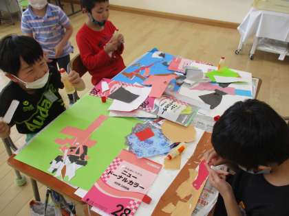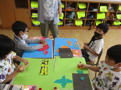図画工作では、紙をちぎった形からいろいろなものを考えました。恐竜やご飯、銃等、想像を膨らませて作っていました。