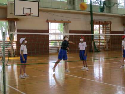 体育科では、ソフトバレーボールをしています。チームごとに練習した後、試合をしました。なかなかパスがつながらず、点数につながらなかったと話している子供もいましたが、どのチームも一生懸命に取り組んでいました。これから、みんなでパスをつないで楽しめるようルールをみんなで考えていこうと思います。