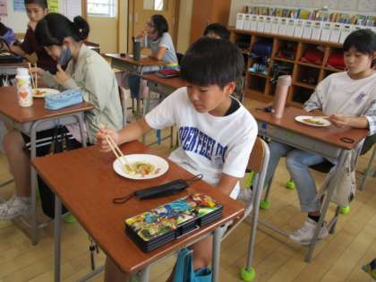 家庭科の学習で調理実習をしました。今日は、朝食に合うおかず作りで、「いろどりいため」を作りました。にんじん、ピーマン、たまねぎ、ハムを短冊切りや千切り等、切り方に気を付けて切りました。子供たちは、包丁の扱いにも気を付けながら上手に切っていました。次に、フライパンで炒めました。入れる順番や火加減を調整しながら、楽しそうに炒めていました。きれいに盛り付けて、おいしくできたと嬉しそうでした。