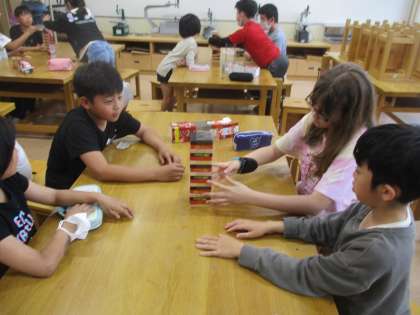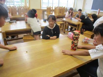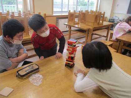 今日は、ジェンガをしました。上の学年の子供たちがリーダーとなり、自分たちで活動を進めていました。