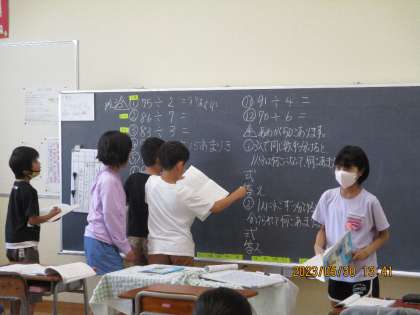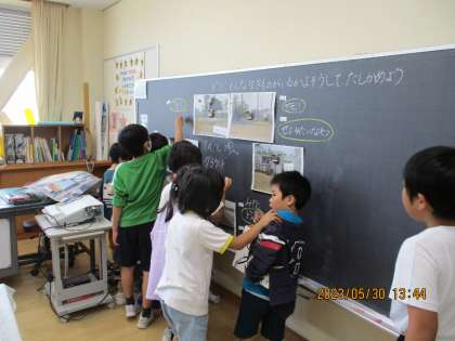 見つけた虫とその場所を黒板に書き、みんなで紹介しあいました。