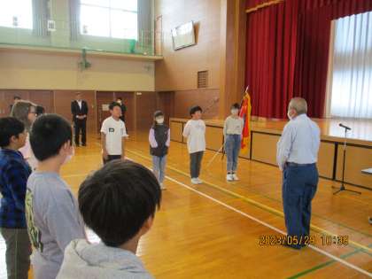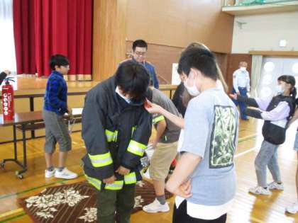 富山市消防局和合出張所から消防士さんをお招きし、BFCのバッヂの授与式を行いました。火災予防のリーダーとしてしっかりと行動できるよう、火災の怖さや消火活動について真剣に学ぼうと取り組んでいました。
