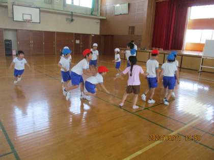 「メリーゴーランドの動きって、どんな動き?」と尋ねられ子供たちは、さっと円とつくって、回ったり跳んだり、思い思いに体を動かしました。 -