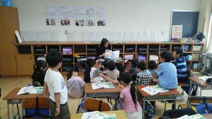 2年生は、1時間目の始めの方で、担任の読み聞かせを聞いていました。担任の先生の周りに集まって嬉しそうに聞いていました。