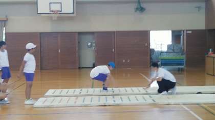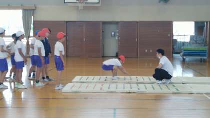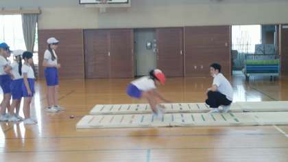 6年生は、5時間目に体育館で新体力テストの立ち幅とびをしていました。腕をふってとぶタイミングにあわせるのが難しそうでした。
