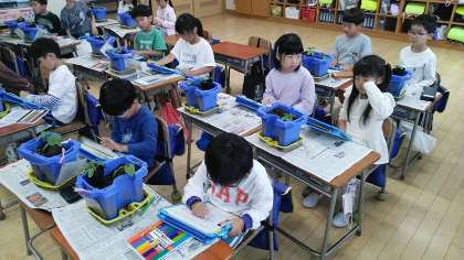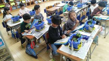 1年生の1時間目は、生活科の学習でした。あさがおの観察をしているところでした。みんなのあさがおがちょうど本葉が数枚出てきたところで、双葉と本葉の違いを形や色、手触り等から見付けていました。