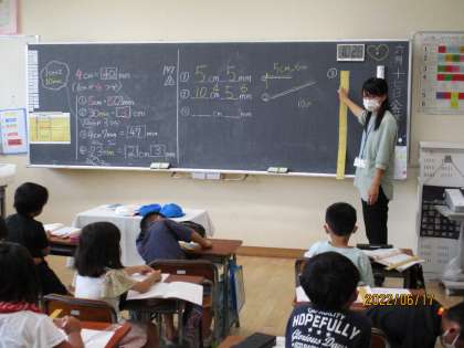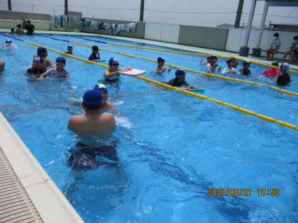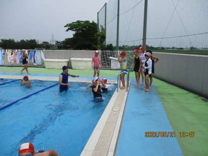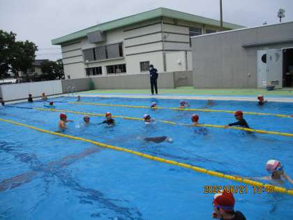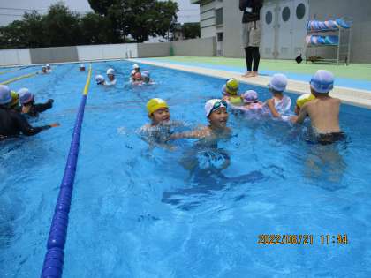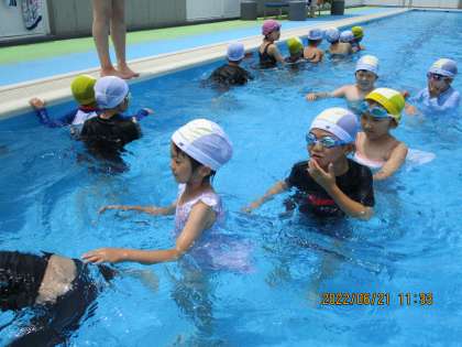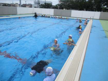 幼稚園や保育所とは違う、プールの広さや深さに、ドキドキしている様子でしたが、2年生のお兄さんお姉さんと一緒に楽しく活動していました。 -