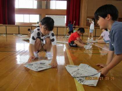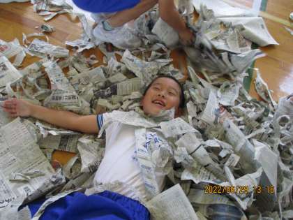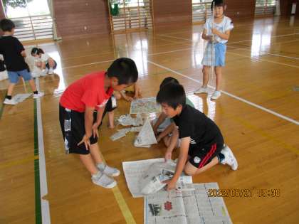 図工の時間には、体育館で新聞紙を使っていろんなものを作りました。