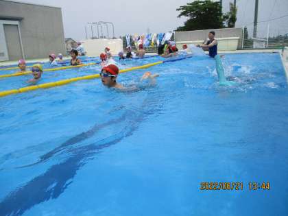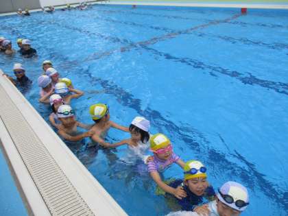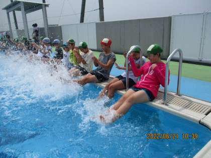 今日はプールに入りました。1、2年生でバディを組み、一緒に活動しています。みんなで列車になったり、フラフープをくぐってみたりと、とても楽しそうでした。