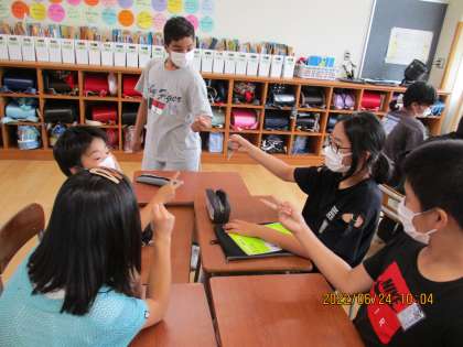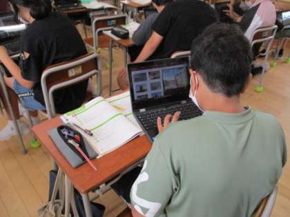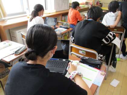 外国語科では、「Let's go to Italy」の学習をしています。自分が行ってみたい国についてスピーチをします。今日は、スピーチに向けて、それぞれの国の観光地や食べ物を調べました。子供たちは、有名な建物やきれいな風景、おいしそうな食べ物を見付け、楽しそうに調べていました。また、調べたことを英語で話せるよう、ALTの先生に質問をしながら一生懸命に取り組んでいました。
