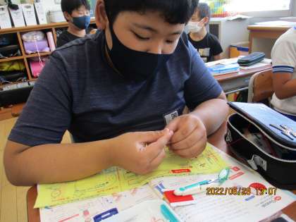 今日は、「〜は」「〜を」「〜へ」の文をペアの友達と考えました。どんな文にするか、楽しそうに話しながら書いていました。