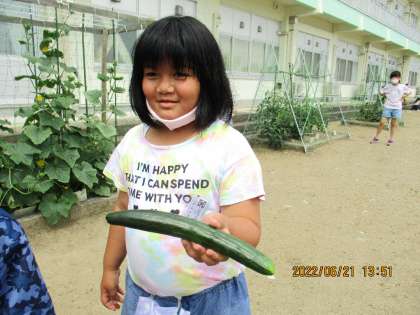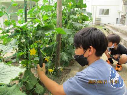 キュウリを育てている子供たちが何人か収穫できたようです。