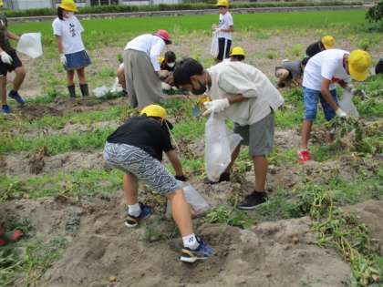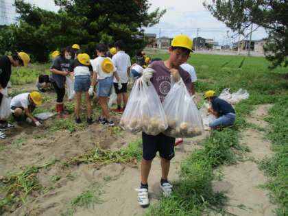 用務員さんが育ててくださり、理科の実験でも使わせていただいたじゃがいも収穫しました。土を掘ると、大きなじゃがいもがたくさん出てきて、子供たちは「すごい」と歓声をあげながら収穫をしてました。袋いっぱいにじゃがいもを掘ることができ、暑い中でしたが、楽しんで収穫しました。用務員さんに感謝ですね。