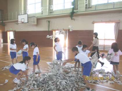 破ったり、丸めたり、折ったり、つなげたりしながら、思い思いに表現していました。 -
