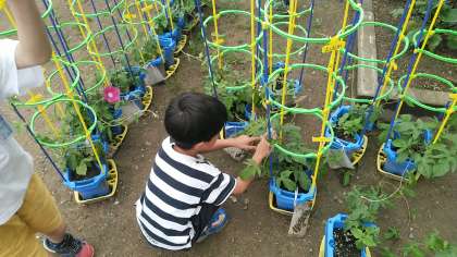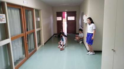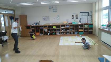 つばめ野級2組は、4時間目にオリジナルのすごろくをつくっていました。ますめに入れるかどうかを考えるため、ロープのひっぱりあいの実験をしていました。
