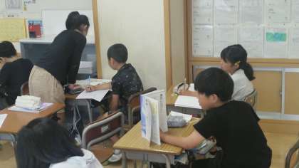 6年生の4時間目は、国語科の学習でした。主語と述語が2つ以上入っている文章を二つの文章に分ける作業をしていました。