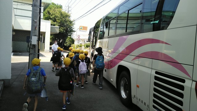 今日は、3年生の校外学習です。市役所や岩瀬の展望台等に行ってきます。バスに乗って学校を出発しました。
