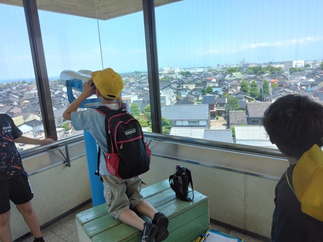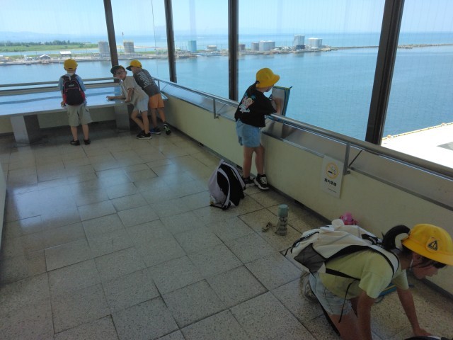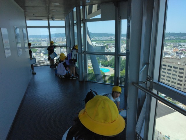 富山市役所展望塔です。海の方向を確かめて、建物や山等、たくさん見付けていました。