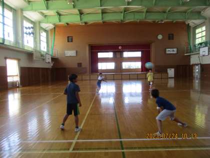 体育館で全力ドッジボールをして、体づくりをしました。 -