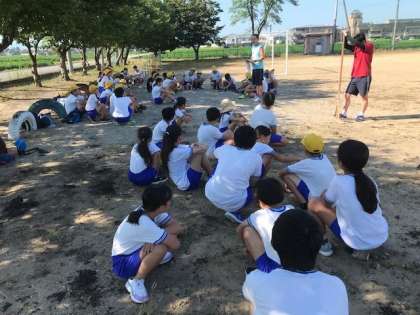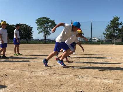 木陰で練習の進め方を確認した後、短距離走やボール投げなどの練習を行いました。