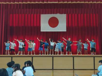 終業式のあと、2年生が全校の前でだらまつりで踊るダンスを披露しました。