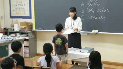 終業式の後、教室では担任からあゆみが一人一人に渡されていました。