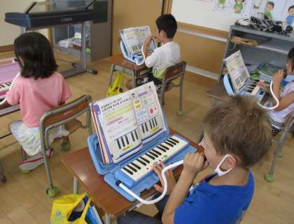 音楽の学習で鍵盤ハーモニカの練習を始めました。「たのしくうたおう」の曲に合わせて、いろいろな音をふいてみています。一つの音、二つの音、長い音、短く切る音、高い音、低い音など、タンギングに気をつけて楽しみながらふいています。
