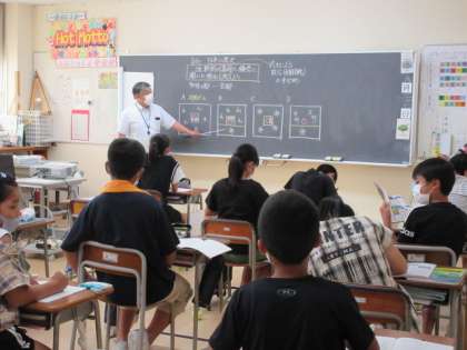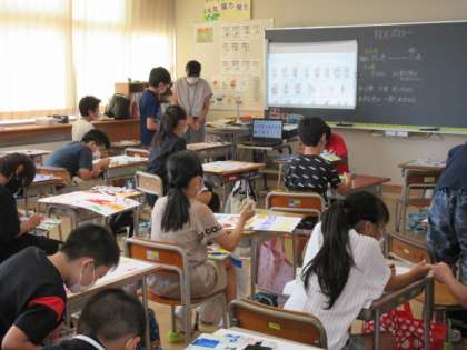 涼しい教室では、6年生が集中して、教頭先生と社会科の学習を進めています。