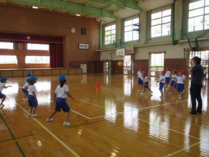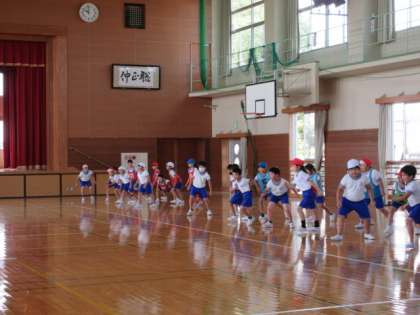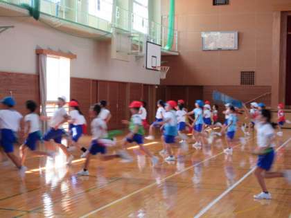 外の強い日差しを避け、体育館で、追いかけ走をしています。みんな集中して、相手の背中を見ながら猛ダッシュ!