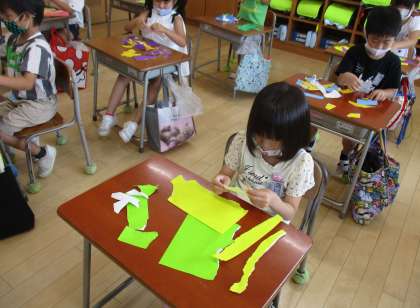 図画工作科の学習で「やぶいたかみから うまれたよ」に取り組みました。色紙2枚をそっと破いて、破いた形から何が見えてくるか考えました。紙を動かしたり、重ねたりするうちに、だんだん何かの形に見えてきたようでした。いろいろ想像しながら、楽しく作品作りに取り組んでいました。