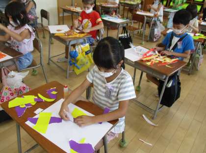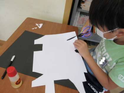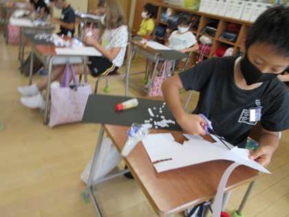 はさみを上手に使って、思いつくままにいろいろな形を切り取っています。中をくり抜くような形に挑戦している子もいます。安全に気を付けながら楽しく学習しています。 -